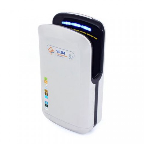 Bezdotykové elektrické vysoušeče rukou Jet Dryer Slim jsou nejmenší vysoušeče z řady Jet Dryer. Díky svým malým rozměrům nezabírají moc místa a je možné je použít i do menších prostor. Vnitřní vysoušecí prostor je osvětlený úspornými LED diodami. Tryskové vysoušeče SLIM nabízejí výběr ze dvou rychlostí sušení. Na nižší stupeň je jejich provoz velmi tichý, na vyšším stupni trvá vysoušení kratší dobu. Provoz vysoušečů je zcela bezkontaktní. Nasávaný vzduch je filtrovaný přes HEPA filtr. Efektivní doba sušení: 10 - 15 s. Rychlost proudění vzduchu: 85 - 105 m/s. Objem odkapové nádoby: 1000 ml.Bezdotykové elektrické vysoušeče rukou Jet Dryer Slim