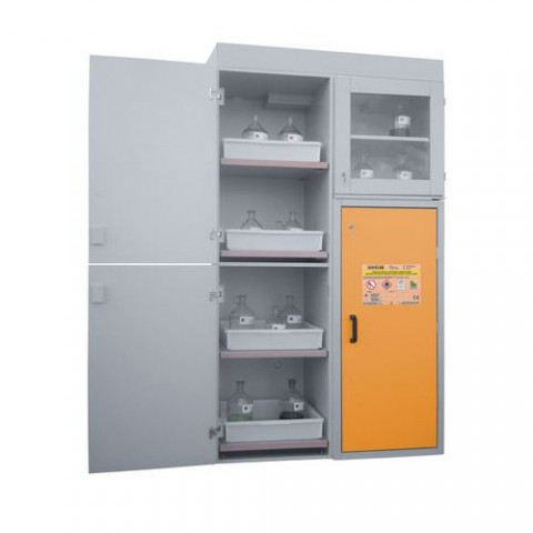 Pro bezpečné a předpisové skladování agresivních i hořlavých látek (v protipožárním oddíle) na pracovištích podle EN 14470-1 a TRGS 510 s požární odolností 30 minut. Konstrukce skříně ze speciálního materiálu B1 v barvě šedé RAL 7035, s dveřmi v šedé RAL 7035 (416048) a žluté RAL 1007 (416049). Samostatně uzamykatelné oddíly cylindrickým zámkem pro skladování různých typů kapalin. Provoz dle TRGS 510 (schválené použití i bez napojení na odsávání vzduchu). Přípojka na odvětrávací systém DN 80 v horní části skříně. Výškově nastavitelné police v rastru 32 mm. Značení podle EN 14470-1 / TRGS 510, uzemnění ve shodě s TRBS 2153. Možnost vyrovnání drobných nerovností podlahy rektifikačními šrouby.Bezpečnostní skříně na agresivní látky i hořlaviny KOMBILAB StoreLAB TYP 30, 30 minut, 4 police