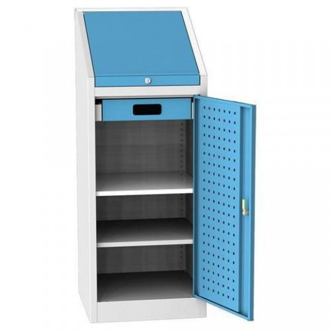 Dílenské skříňky jsou určeny do výrobních prostor, autoservisů, garáží, škol, výukových center apod. Svařovaná konstrukce z ocelového plechu. Horní pult pro uchovávání a pořizování dokumentů v provozech. Dvě výškově stavitelné police, jedna zásuvka. Vnitřní strana dvířek s perforacemi pro uchycení nástrojů. Uzamykání cylindrickým zámkem se dvěma klíči. výška zásuvky: 9 cm výsuv zásuvek: 100 % povrchová úprava práškovým lakem, zkompletovánoDílenské skříně na nářadí, 130 x 50 x 50 cm