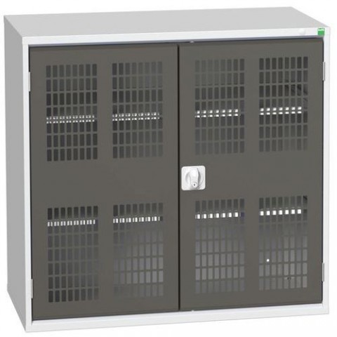 Kovové dílenské skříně s drátěnými dveřmi pro dobrou ventilaci i přehlednost obsahu. Pozinkované police s nosností 75 kg jsou výškově nastavitelné v rastru 25 mm. Svařovaná ocelová konstrukce, povrchová úprava práškovým lakem. Zamykání tříbodovým cylindrickým rozvorovým zámkem.Dílenské skříně policové s drátěnými dveřmi Bott Verso, výška 100 cm