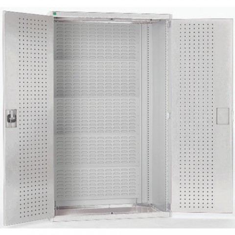 Zadní stěna s perforací pro zavěšení plastových boxů a vnitřní strany dveří pro uchycení držáků nářadí. Robustní svařovaná ocelová konstrukce s nosností až 1,5 tuny, povrchová úprava práškovým lakem. Vyztužené křídlové dveře, uzamykání cylindrickým zámkem se dvěma klíči. Držáky nářadí nejsou součástí dodávky.Dílenské skříně s perfo panely pro držáky na boxy/nářadí