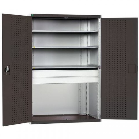Kovové dílenské skříně vybaveny policemi s nosností 160 kg a zásuvkami pro efektivní využití v provozech a dílnách. Robustní svařovaná ocelová konstrukce s nosností až 1,5 tuny, povrchová úprava práškovým lakem. Vyztužené křídlové dveře s perforovanou vnitřní stranou pro uložení nářadí. Tříbodový cylindrický rozvorový zámek se dvěma klíči. Pozinkované police výškově nastavitelné v rastru 25 mm. Zásuvky s nosností 75 kg a 100% výsuvem na válečkových ložiskách.Dílenské skříně se zásuvkami Bott Cubio 160, výška 200 cm