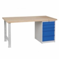 Dílenský stůl Weld ve dvou barevných variantách složený z pracovní desky, pevného podnoží a kontejneru s pěti zásuvkami. Stůl je stabilní a vyhovuje i náročnějším pracovním úkolům díky robustnímu provedení podnoží, vyšší váze bukové spárovky i nahrazením podnoží za kontejner. Pracovní deska 170 x 80 cm z bukové spárovky tl. 4 cm, sražené hrany, bez povrchové úpravy. Maximální nosnost pracovní desky při rovnoměrném zatížení 500 kg. Svařovaný podstavný kontejner v x š x h: 80 x 51 x 59 cm, celková nosnost 300 kg, výsuv 100%, kuličková ložiska pojezdů. Podstavný kontejner uzamykatelný cylindrickým zámkem se dvěma klíči, horní dvě zásuvky včetně dělicích příček (příprava pro děliče ve třech horních zásuvkách). Vnitřní rozměry zásuvek v x š x h: 3 zásuvky 90 x 435 x 524 mm, 2 zásuvky 167 x 435 x 524 mm. Pevné podnoží z ocelového U - profilu 50 x 70 cm, tl. 3mm a ocelových plechů tl. 0,8 mm.Dílenské stoly Weld, 84 x 170 x 80 cm