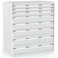Zásuvkové skříně Bott Cubio se zásuvkami s nosností 75 kg a 100% výsuvy na válečkových ložiskách. Robustní svařovaná ocelová konstrukce s nosností až 1,5 tuny, povrchová úprava práškovým lakem. Systém centrálního zámku i blokace otevření více zásuvek najednou. Ergonomické rukojeti s popisovatelnou lištou, uzamykání cylindrickým zámkem se dvěma klíči.Dílenské zásuvkové skříně Bott Cubio, 120 x 105 x 65-75 cm, 8 zásuvek