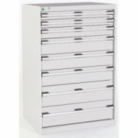 Zásuvkové skříně Bott Cubio se zásuvkami s nosností 75 kg a 100% výsuvy na válečkových ložiskách. Robustní svařovaná ocelová konstrukce s nosností až 1,5 tuny, povrchová úprava práškovým lakem. Systém centrálního zámku i blokace otevření více zásuvek najednou. Ergonomické rukojeti s popisovatelnou lištou, uzamykání cylindrickým zámkem se dvěma klíči.Dílenské zásuvkové skříně Bott Cubio, 120 x 80 x 52,5-75 cm, 8 zásuvek