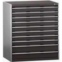 Zásuvkové skříně Bott Cubio se zásuvkami s nosností 200 kg a 100% výsuvy na válečkových ložiskách. Robustní svařovaná ocelová konstrukce s nosností až 1,5 tuny, povrchová úprava práškovým lakem. Systém centrálního zámku i blokace otevření více zásuvek najednou. Ergonomické rukojeti s popisovatelnou lištou, uzamykání cylindrickým zámkem se dvěma klíči.Dílenské zásuvkové skříně Bott Cubio 200, 120 x 105 x 65-75 cm, 10 zásuvek