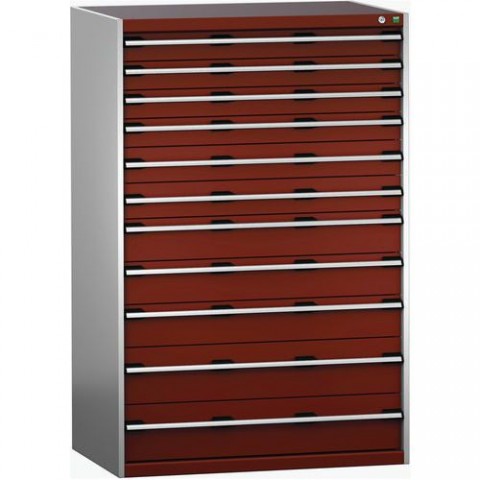 Zásuvkové skříně Bott Cubio se zásuvkami s nosností 200 kg a 100% výsuvy na válečkových ložiskách. Robustní svařovaná ocelová konstrukce s nosností až 1,5 tuny, povrchová úprava práškovým lakem. Systém centrálního zámku i blokace otevření více zásuvek najednou. Ergonomické rukojeti s popisovatelnou lištou, uzamykání cylindrickým zámkem se dvěma klíči.Dílenské zásuvkové skříně Bott Cubio 200, 160 x 105 x 65-75 cm, 11 zásuvek