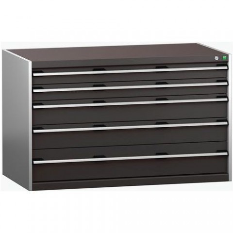 Zásuvkové skříně Bott Cubio se zásuvkami s nosností 200 kg a 100% výsuvy na válečkových ložiskách. Robustní svařovaná ocelová konstrukce s nosností až 1,5 tuny, povrchová úprava práškovým lakem. Systém centrálního zámku i blokace otevření více zásuvek najednou. Ergonomické rukojeti s popisovatelnou lištou, uzamykání cylindrickým zámkem se dvěma klíči.Dílenské zásuvkové skříně Bott Cubio 200, 80 x 130 x 65-75 cm, 5 zásuvek
