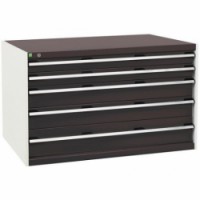Zásuvkové skříně Bott Cubio se zásuvkami s nosností 75 kg a 100% výsuvy na válečkových ložiskách. Robustní svařovaná ocelová konstrukce s nosností až 1,5 tuny, povrchová úprava práškovým lakem. Systém centrálního zámku i blokace otevření více zásuvek najednou. Ergonomické rukojeti s popisovatelnou lištou, uzamykání cylindrickým zámkem se dvěma klíči.Dílenské zásuvkové skříně Bott Cubio, 80 x 130 x 65-75 cm, 5 zásuvek