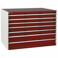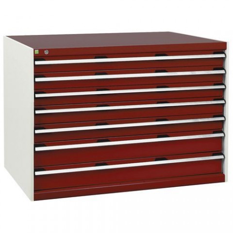 Zásuvkové skříně Bott Cubio se zásuvkami s nosností 75 kg a 100% výsuvy na válečkových ložiskách. Robustní svařovaná ocelová konstrukce s nosností až 1,5 tuny, povrchová úprava práškovým lakem. Systém centrálního zámku i blokace otevření více zásuvek najednou. Ergonomické rukojeti s popisovatelnou lištou, uzamykání cylindrickým zámkem se dvěma klíči.Dílenské zásuvkové skříně Bott Cubio, 90 x 130 x 65-75 cm, 7 zásuvek