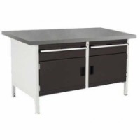 Dílenské stoly Bott Cubio Storage s pracovní deskou tloušťky 4 cm typu multiplex nebo linoleum. Nosnost až 800 kg, robustní svařovaná ocelová konstrukce, povrchová úprava práškovým lakem. Centrálně uzamykatelné zásuvky s výškou 15 cm, nosností 75 kg a 100% výsuvem na válečkových ložiskách. Uzamykatelné skříňky s výškou dveří 35 cm, uvnitř pozinkovaná výškově nastavitelná police s nosností 100 kg.Dílenský stůl Bott Cubio Storage, 84 x 150 x 75 cm, 2 skříňky, 2 zásuvky, linoleum/multiplex