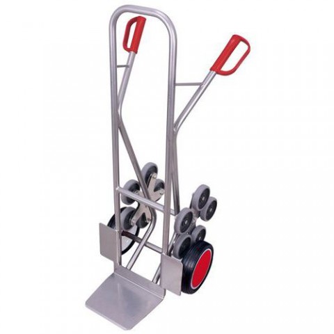 Hliníkový rudl na schodiště pro přepravu břemen. Pětihvězdicová kola z šedé termoplastické pryže. Rozměry lopaty 300 x 250 mm. Vyrobeno ze svařovaných hliníkových trubek. Plastová madla s bezpečnostní ochranou zamezující poranění rukou. Pneumatiky na ocelovém ráfku nebo celopryžová kola na speciálním plastovém ráfku s přesnými kuličkovými ložisky a plastovým krytem kola.Hliníkové schodišťové rudly RU219, do 200 kg, 61 x 67,5 x 131 cm