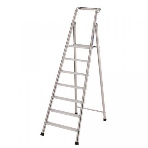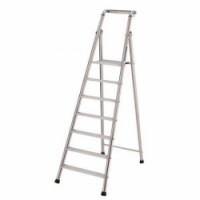 Skládací hliníkové schůdky s jednostranným vstupem, vhodné pro stavební a řemeslné práce. Madlo je opatřené háčkem na kbelík a odkládací plochou na nářadí a drobné předměty. Robustní konstrukce zajišťuje tuhost schůdků. Vroubkovaný protiskluzový povrch stupňů, vzdálenost mezi stupni je 25 cm. Opatřené plastovými ochrannými patkami.Hliníkové schůdky Harry, 7 stupňů