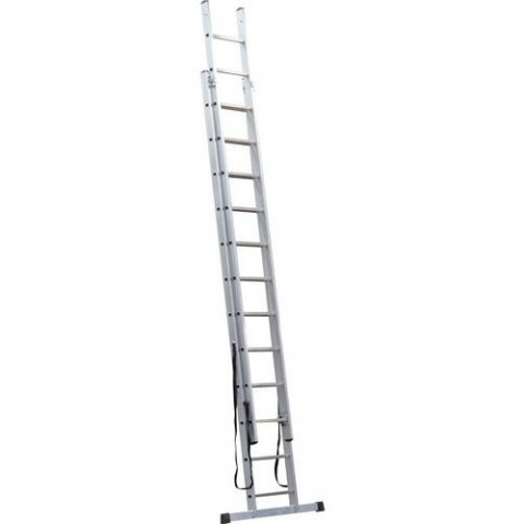 Univerzální žebřík ze dvou dílů po dvanácti příčkách, vhodný pro profesionální užívání. Možnost použít jako štafle nebo jako výsuvný opěrný žebřík. Vyšší bezpečnost zajišťují ochranné napínací pásy a protiskluzové plastové patky. Základna na jedné straně žebříku je pro vyšší stabilitu rozšířená. Splňuje normu ČSN EN 131 a je opatřen TÜV certifikátem.Hliníkový žebřík PROFI, 2 x 12 příček, Alpos Alu