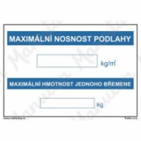 Značky, tabulky a samolepky "Maximální nosnost podlahy" jsou tištěny na velmi kvalitním materiálu, barvami s vysokou odolností proti otěru a UV záření. Zaručujeme splnění požadavků technických a právních předpisů, zejména Nařízení vlády č. 375/2017 Sb., ČSN ISO 3864-1, ČSN ISO 3864-2, ČSN ISO 3864-3, ČSN ISO 3864-4. Tabulka je předepsána předpisy ve všech skladech. Označuje maximální nosnost podlahy kg/m2 a maximální hmotnost jednoho břemene. Pokud tento údaj není v dokumentaci stavby, je nutné tento bezpečnostní údaj zvolit podle tabulek konstrukce stropu nebo podlahy, případně jej nechat spočítat statikem. Zejména jedná-li o strop, kde předpokládané zatížení bude vyšší než 150 kg/m2 na více než 1/3 plochy, nebo hmotnost jediného břemene přesahuje 500 kg.Informační tabulky - Maximální nosnost podlahy