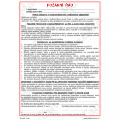 Bezpečnostní značení tabulkou, značkou nebo samolepkou "Požární řád" je tištěno na vysoce kvalitním materiálu, barvami s vysokou odolností proti otěru a UV záření. Tak, aby provedení značení bylo plně v souladu s Nařízením vlády č. 375/2017 Sb., ČSN ISO 3864 a ČSN ISO 3864-1.Informační tabulky - Požární řád stolárna