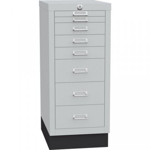 Kovové zásuvkové skříňky s osmi zásuvkami a soklem. Centrální zámek zásuvek.Jednořadé kovové kartotéky A4 Esk, 8 zásuvek