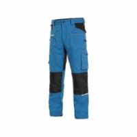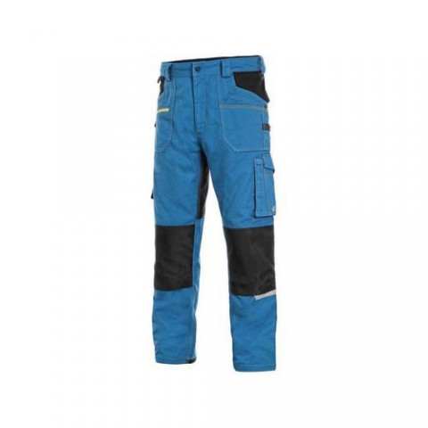 Pánské montérkové kalhoty - zkrácená varianta na výšku 170-176 cm. Strečová tkanina umožňující volný pohyb, pas s poutky na opasek, přední kapsy s kapsou na zip, multifunkční kapsy na obou stranách, kolena zesílena 600D polyesterem s možností vložení Velikost: 44-64 Reflexní doplňky: Ano Délka produktu: Zkrácená velikost 170-176 cmKalhoty CXS STRETCH, 170-176cm, pánská, středně modrá-černá