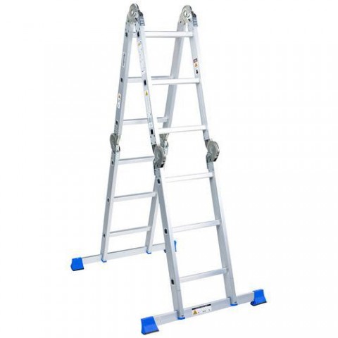Kloubový hliníkový žebřík ze čtyř dílů po třech příčkách, vhodný pro profesionální použití. Možnost sestavení jako opěrný žebřík, stojací štafle nebo lešení. Součástí je pochozí ocelová podlážka. Pracovní výška - lešení 2,8 m; štafle 2,92 m a opěrný žebřík 4,1 m. Celková výška - lešení 0,9 m; štafle 1,62 m a opěrný žebřík 3,3 m.Kloubový hliníkový žebřík Manutan Expert s podlážkou, 4 x 3 příčky