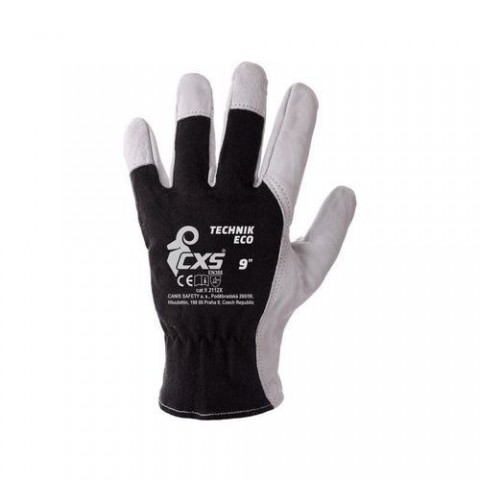 Rukavice se hřbetem z černého pružného úpletu. Doporučené použití: určeno pro suchá i lehce vlhká prostředí. Odvětví: stavebnictví, pneuservisy, logistika a přeprava. Velikost: 8, 9, 10 Piktogramy: 9, 10 Normy: EN 420 Materiálové složení: dlaň - kozinková lícovka, hřbet - bavlněný úpletKombinované rukavice TECHNIK ECO, černo-bílé