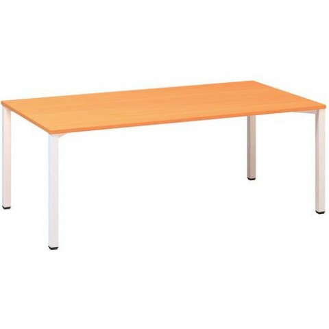 Jednací stoly Alfa 420 v pěti barevných provedeních s bílým podnožím. Desky stolu jsou vyrobeny z laminované dřevotřísky tloušťky 25 mm s ABS hranou 2 mm. Rámové podnoží je tvořeno dvěma sestavami kovových nohou o průřezu 5 x 5 cm. Obě sestavy nohou jsou spojeny železným profilem, který rovněž slouží jako výztuha stolové desky. Nohy jsou opatřeny rektifikací v rozsahu 15 mm pro vyrovnání nerovností podlahy. Díky povrchové úpravě epoxy-polyesterovou barvou se podnoží vyznačuje vysokou odolností proti všem druhům poškození v běžném kancelářském provozu. Konferenční stoly splňují normy ISO9001, ISO14001, ČSN18001, Ekologicky šetrný výrobek.Konferenční stoly Alfa 420 s bílým podnožím, 200 x 100 x 74,2 cm