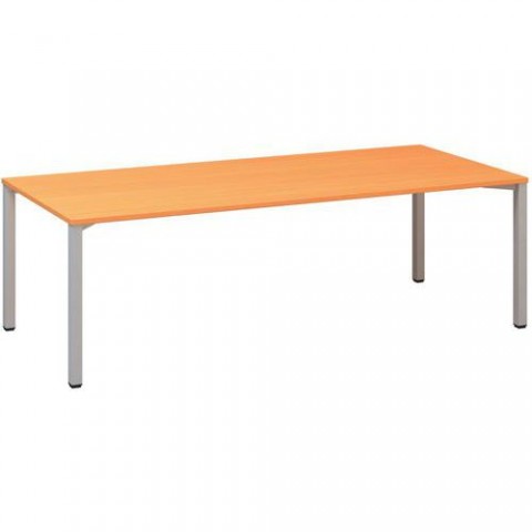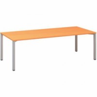 Jednací stoly Alfa 420 v pěti barevných provedeních. Desky stolu jsou vyrobeny z laminované dřevotřísky tloušťky 25 mm s ABS hranou 2 mm. Rámové podnoží je tvořeno dvěma sestavami kovových nohou o průřezu 5 x 5 cm. Obě sestavy nohou jsou spojeny železným profilem, který rovněž slouží jako výztuha stolové desky. Nohy jsou opatřeny rektifikací v rozsahu 15 mm pro vyrovnání nerovností podlahy. Díky povrchové úpravě epoxy-polyesterovou barvou se podnoží vyznačuje vysokou odolností proti všem druhům poškození v běžném kancelářském provozu. Konferenční stoly splňují normy ISO9001, ISO14001, ČSN18001, Ekologicky šetrný výrobek.Konferenční stoly Alfa 420 s šedým podnožím, 240 x 100 x 74,2 cm