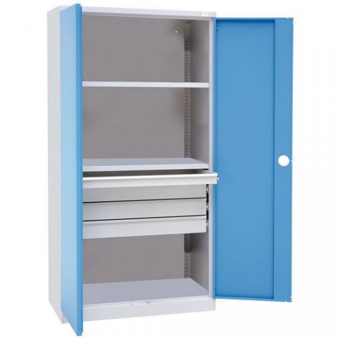 Svařovaná dílenská skříň je vhodná pro uložení pracovních nástrojů a pomůcek. Skříň je vybavena dvěma výškově stavitelnými policemi a čtyřmi zásuvkami. Police výškově přestavitelné v rastru 23 mm, zásuvky se 100% výsuvem. Zamykání cylindrickým rozvorovým zámkem se dvěma klíči. Otevírání dveří až 215°.Kovová dílenská skříň Manutan Expert, 195 x 100 x 50 cm, 4 zásuvky