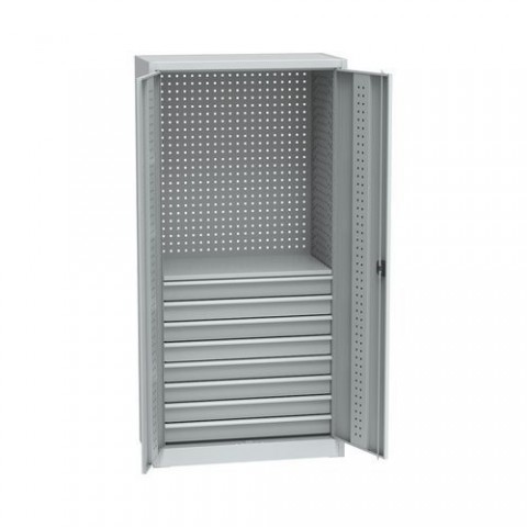 Svařované kovové dílenské skříně s policí a osmi zásuvkami vhodné do výrobních prostor, autoservisů nebo laboratoří. Vnitřní stěny a dveře s perforací pro umístění držáků na nářadí. Osm zásuvek s rozměry 10 x 82,7 x 46 cm s teleskopickým kuličkovým 100% výsuvem. Zásuvky lze přestavit v rastru 50 mm, polici v rastru 25 mm. Vnitřní panty s úhlem otevření 110°. Vyrobeny z plechu tl. 0,7 mm. Dno korpusu je vyztužené kovovými patkami. Dvoubodové uzamykání dveří v horní a spodní části skříně pomocí cylindrického rozvorového zámku (možnost dodání hlavního univerzálního klíče).Kovové dílenské skříně na nářadí, 8 zásuvek, 195 x 95 x 50 cm