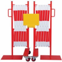 Sada výsuvných zábran pro dočasné zablokování a zajištění přístupu na široké plochy. Středový upevňovací prvek nejen spojuje obě zábrany, ale lze jej použít i k zobrazení informačního listu formátu A4. Robustní a stabilní: zábrany na kolečkách s brzdami pro bezpečné a snadné používání.Kovové mobilní zábrany Dancop, skládací