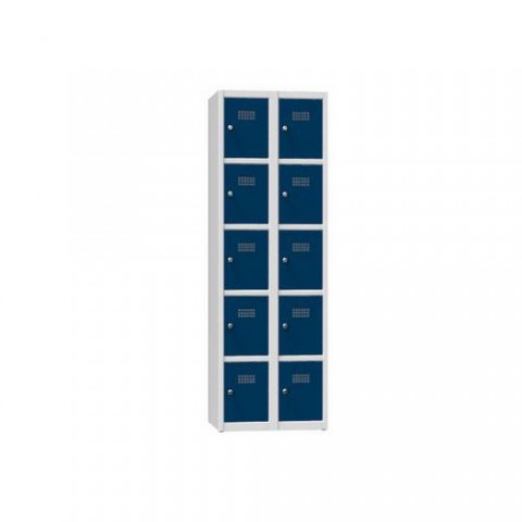 Plechové šatní skříně pro uložení drobných osobních věcí. Dveře jednotlivých boxů jsou uloženy na vnitřních pantech s úhlem otevření více než 90°. Šatníky jsou standardně vybaveny cylindrickým zámkem pro každou buňku (možnost zámku s cylindrickou vložkou nebo uzávěru pro visací zámky). Součástí jsou plastové háčky pro zavěšení uschovaných věcí. Větrací otvory ve dvířkách. K dostání ve třech barevných variantách.Kovové šatní skříně, 10 boxů, 1850 x 600 x 500 mm, šedá