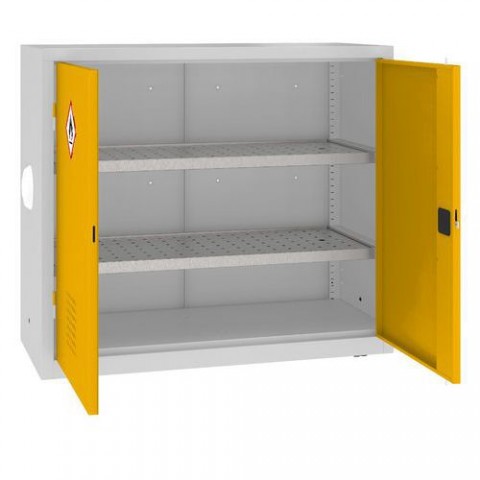 Nízké kovové skříně pro skladování chemikálií. Vybavené retenčními policemi s roštem s pozinkovaným povrchem, nastavitelné v rastru 25 mm. Monolitická svařovaná konstrukce z oceli tl. 1 mm zajišťuje vysokou pevnost. Křídlové dveře mají větrací otvory pro cirkulaci vzduchu a jsou opatřené štítkem GHS-02 pro standardní identifikaci chemického nebezpečí. Tříbodový zámek RONIS (dodáváno se 2 klíči). Vyrovnávací nožky, které jsou nastavitelné zevnitř. Posuvníky pro snadný pohyb skříně a ochranu podlahy. Pro vysokou bezpečnost lze přikotvit ke zdi. Před lakováním jsou skříně potaženy zirkoniovou vrstvou, která je chrání před korozí a zvyšuje přilnavost laku. Skříně jsou opatřené nátěrem, který má klasifikaci reakce na oheň: A2-s1, d0 dle norem PN-EN 13501-1:2019-02. Vyráběno v souladu s normami ISO:9001 a ISO:14001.Kovové skříně na chemikálie, 104 x 120 x 50 cm