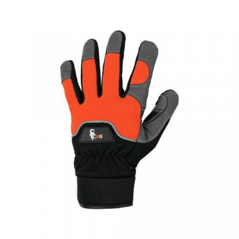 Kombinované pracovní rukavice z jemné a pevné syntetické kůže se hřbetem z prodyšného Spandexu. Reflexní proužek na hřbetu zvyšuje viditelnost pracovníka. Polyuretanové vycpávky na dlani tlumí otřesy, nárazy a vibrace vznikající při práci. Neoprenová manžeta se suchým zipem v oblasti zápěstí ulehčuje navlékání a svlékání rukavice a zabraňuje jejímu sklouznutí. Odolné vůči natahování, srážení a tvrdnutí.Kožené rukavice CXS Puno ze syntetické kůže, černé/oranžové