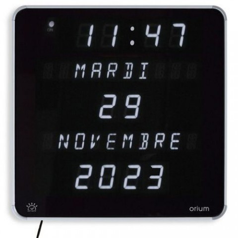 LED digitální hodiny s kalendářem. Skvělá čitelnost až z 30 metrů díky vysoce kontrastnímu displeji: Bílá na černé. Snížení intenzity světla od 22:00 do 7:00. Zobrazení kalendáře (datum a měsíc zobrazeny v plném znění) v 5 jazycích (DE/EN/ES/FR/NL). Snadné nastavení pomocí 3 tlačítek. Automatická změna letního/zimního času (DST).LED digitální hodiny Orium Ephéméris Blanc DST