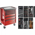 Servisní vozík se sadou nářadí 135 ks. Integrovaná rukojeť a pracovní plocha z nerezové oceli. Anti-tilt bezpečnostní systém blokace proti otevření více zásuvek najednou. Čtyři otočná kola 125 mm včetně jednoho brzděného. 100% výsuv zásuvek.Montážní vozík SAM s nářadím, 81,7 x 67,8 x 45,9 cm