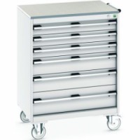 Mobilní zásuvkové skříně Bott Cubio s horní pracovní plochou tloušťky 2 cm typu multiplex/linoleum nebo ohraněný plech s rohoží. Nosnost až 600 kg, robustní svařovaná ocelová konstrukce, povrchová úprava práškovým lakem. Centrálně uzamykatelné zásuvky s výškou 3 x 10, 2 x 15 a 1 x 20 cm, nosností 50 kg a 100% výsuvem na válečkových ložiskách. Ergonomické rukojeti zásuvek s popisovatelnou lištou, systém blokace otevření více zásuvek najednou. Dvě pevná a dvě otočná kola s brzdou o průměru 12,5 cm.Mobilní zásuvková skříň Bott Cubio, 109 x 80 x 65 cm, 6 zásuvek, multiplex/linoleum/rohož