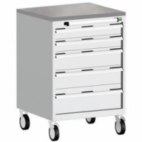 Mobilní zásuvkové skříně Bott Cubio s horní pracovní plochou tloušťky 2 cm typu multiplex/linoleum nebo ohraněný plech s rohoží. Nosnost až 300 kg, robustní svařovaná ocelová konstrukce, povrchová úprava práškovým lakem. Centrálně uzamykatelné zásuvky s výškou 2 x 10, 2 x 15 a 1 x 20 cm, nosností 50 kg a 100% výsuvem na válečkových ložiskách. Ergonomické rukojeti zásuvek s popisovatelnou lištou, systém blokace otevření více zásuvek najednou. Dvě pevná a dvě otočná kola s brzdou o průměru 12,5 cm.Mobilní zásuvková skříň Bott Cubio, 99 x 65 x 65 cm, 5 zásuvek, multiplex/linoleum/rohož