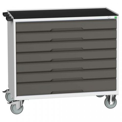 Mobilní pracovní stůl se zásuvkami Bott Verso s horní pracovní plochou tloušťky 3 cm typu multiplex/linoleum nebo ohraněný plech s rohoží. Nosnost až 200 kg, robustní svařovaná ocelová konstrukce, povrchová úprava práškovým lakem. Centrálně uzamykatelné zásuvky s výškou 6 x 10, 1 x 12,5 cm, nosností 50 kg a 100% výsuvem na válečkových ložiskách. Ergonomické rukojeti zásuvek s popisovatelnou lištou, systém blokace otevření více zásuvek najednou. Dvě pevná a dvě otočná kola s brzdou o průměru 12,5 cm, manipulaci usnadňují madla.Mobilní zásuvkové stoly Bott Verso, 98 x 80/105 x 55/60 cm, 7 zásuvek, multiplex/linoleum/rohož
