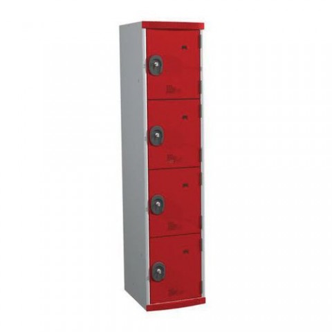 Boxové skříňky se čtyřmi samostatně uzamykatelnými schránkami. Vyrobené z ocelového plechu tl. 0,6 mm. Cirkulaci vzduchu zajišťuje perforace na dveřích. Otevírání dvířek v rozsahu až 120°. Možnost umístění jmenovky do štítku na dveřích. Uzamykání každého boxu cylindrickým zámkem (dodáváno se 2 klíči na 1 zámek).Montované šatní skříně Optimum, 4 boxy, cylindrický zámek