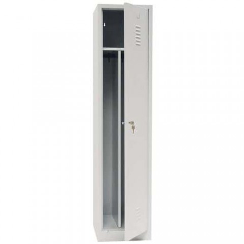 Montovaná šatní skříň na špinavé a čisté prádlo, které je rozdělené vnitřní mezistěnou. Křídlové dveře zavěšené na vnitřních pantech s otevíráním až o 115°. Tiché dovírání díky plastovému dorazu. Kryté perforované otvory ve dveřích zajišťují cirkulaci vzduchu. Odkládací polička ve vrchní části skříně, tyč se dvěma háčky pro zavěšení oděvů.Montované šatní skříně s mezistěnou Manutan Expert Steel, 1 oddíl, základní