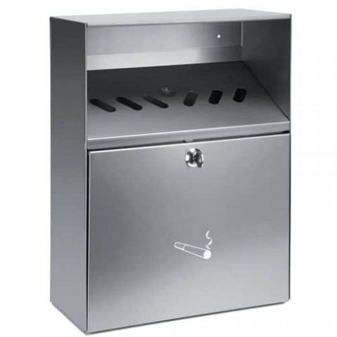 Nástěnný popelník z nerezové/pozinkované oceli s kovovou vložkou. Zámek usnadňuje vyprázdnění otevřením předních dvířek.Nástěnný popelník se stříškou – nerezová ocel_Vepabins