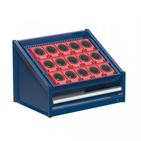 Optimálním prostředkem pro skladování nástrojů i nářadí na pracovním stole je NC stolní stojan. Horní část stojanu můžete vhodně doplnit žlabem s dělením pro drobné nástroje a nářadí. Základní konstrukce stojanu je tvořena sešroubovanými vyztuženými svařenci z ocelového plechu. Boční stěny jsou perforované, aby bylo možné zavěšení nosičů, nástrojových rámů a zásuvek hloubky 19D. Polohu rámů a nosičů můžete nastavit horizontálně nebo pod úhlem 15 či 30 stupňů.NC stolní stojany 36x27D s vybavením, varianta 4