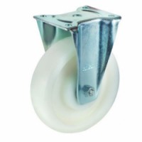Pevné transportní kolo s obručí z bílého nylonu. typ kola: pevná materiál kola: nylon průměr kola: 200 mm šířka kola: 50 mm nosnost: 1 000 kg způsob uchycení: vidlice s přírubou výška kola s vidlicí: 245 mm ložiska: valivá (kuličková) povrchová úprava pozinkováním, odolnost proti teplotě od -40 do +80 °C, odolná proti koroziNylonové transportní kolo s přírubou, průměr 200 mm, valivé ložisko