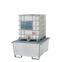 Záchytné vany ke skladování nádrží KTC a IBC, ideální pro plnící a stáčecí procesy. Stabilní ocelová konstrukce. Pro agresivní skladovací kapaliny, jako jsou kyseliny a louhy, může být vana vybavená odolnou vložnou vanou z PE.Ocelová záchytná vana pod IBC kontejner, pozink
