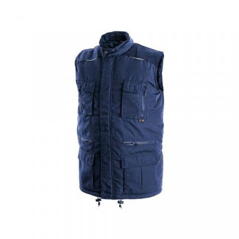 Modrá zateplená pracovní vesta s rameny a límcem prošité manšestrem. Vesta má 14 kapes, z toho tři vnitřní. Možnost stažení vesty v pase.Pánská zimní vesta CXS Ohio, modrá