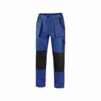 Modré pánské montérky do pasu s černými doplňky. Velké přední a menší boční kapsy schovají telefon, metr a další drobné předměty potřebné k práci. Pohodlné nošení zajišťuje pevný pas se stahovací gumou a našitá poutka umožňují použít opasek. Zdvojená vyztužená partie kolen pomůže při častém klečení.Pánské montérkové kalhoty CXS, modré/černé
