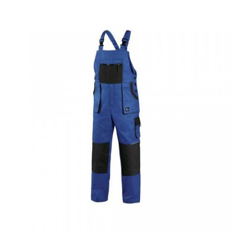 Modré pánské montérky s laclem s černými doplňky. Náprsní kapsa na zip, velké přední a menší boční kapsy schovají telefon, metr a další drobné předměty potřebné k práci. Zdvojená vyztužená partie kolen pomůže při častém klečení. Kšandy do gumy se zapínáním na plastovou přezku.Pánské montérkové kalhoty CXS s laclem, modré/černé