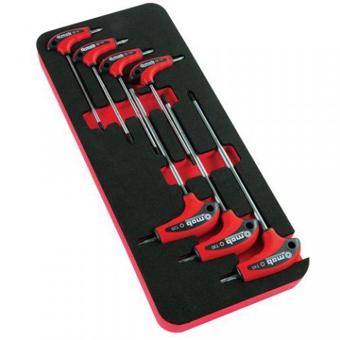Imbusové klíče Torx s T-rukojetí. Chrom-vanadová ocel. Jednodílná kovaná konstrukce bez svařování pro větší pevnost. Bimateriálová rukojeť z černého polypropylenu a červeného elastomeru. Pro rychlé a silné utažení. Dodává se v dvoubarevném pěnovém organizéru o rozměrech 385 x 165 mm s místem pro každý nástroj. Díky červenému pozadí snadno rozpoznáte chybějící nástroje. Dvoubarevná pěna s vysokou hustotou, která se neláme ani nezadržuje vlhkost a je odolná vůči dílenským produktům.Pěnový organizér Mob se sedmi imbusovými klíči Torx