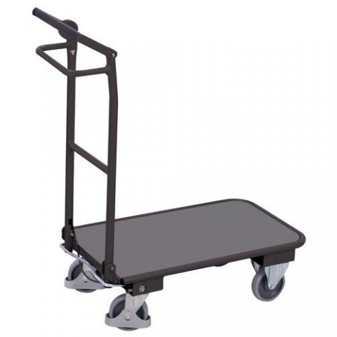 Ocelový plošinový vozík s brzdným madlem. Celé madlo lze jednoduše sklopit. Ložná plocha z MDF desky. Nakládací výška 225 mm. Šedá kola z termoplastické pryže nezanechávající stopy na plastovém ráfku s přesnými kuličkovými ložisky, ochrana nohou. Dvě pevná a dvě otočná kola s brzdou dead-man's brake.Plošinové vozíky s brzdným madlem, 86,5 x 45 x 100,5 cm