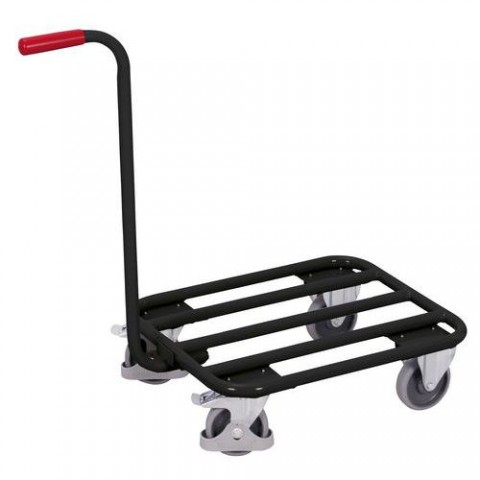 Plošinový vozík s ložnou plochou z ocelových trubek. Madlo s jednoduchou rukojetí. Nakládací výška 185 mm. Šedá kola z termoplastické pryže nezanechávající stopy na plastovém ráfku s přesnými kuličkovými ložisky. 2 pevná a 2 otočná kola s brzdou.Plošinové vozíky s ocelovými příčkami, do 250 kg, 88 x 50 x 88 cm