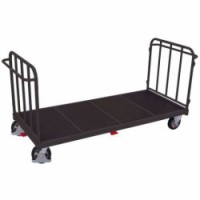 Ocelový plošinový vozík se dvěma trubkovými stěnami o výšce 800 mm s madly. Voděodolná lepená plocha z protiskluzové překližky. Nakládací výška 305 mm. Šedá kola z termoplastické pryže nezanechávající stopy na plastovém ráfku s přesnými kuličkovými ložisky nebo elastická celopryžová kola na litém hliníkovém ráfku s přesnými kuličkovými ložisky.Plošinové vozíky s protiskluzovým povrchem, 2 stěny